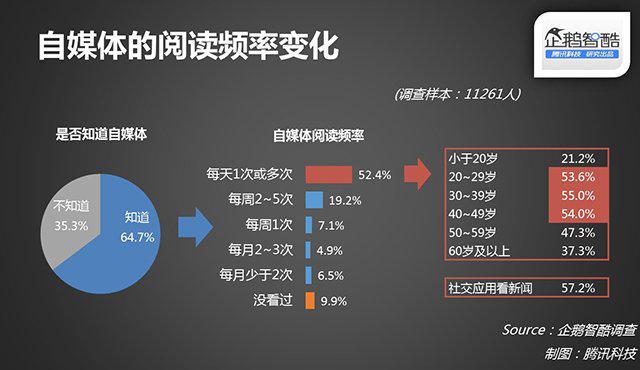 微信“自媒体”这一诞生于2012年、兴起于2013年、爆发于2015年的个体内容创作者群体,受惠于微信公众平台的搭建和微信的社交传播圈,其身份认知已经扩展到了大众用户中。调查中显示,在知道自媒体网民中,每天都会阅读自媒体的人群占比过半。经常阅读自媒体文章的人却并非学生群体等年轻人,而是偏向于已经走向职场的成年人。比如在30岁到39岁的网民中,每天阅读的网民占比为55%,而在小于20岁的用户中,这个占比仅为21.2%。