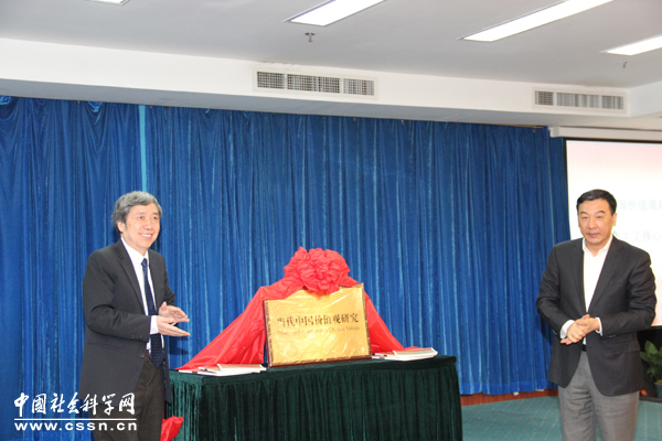 北京师范大学副校长陈光巨(左)与教育部社会科学司司长张东刚为《当代中国价值观研究》揭牌(王海锋摄)
