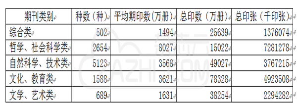 2015年全年我国综合类期刊种数有502种,平均期印数为1494万册,总印数为25639万册,总印张为1376074千印张;哲学、社会科学类期刊种数有2654种,平均期印数为8027万册,总印数为15022万册,总印张为7281278千印张;自然科学、技术类期刊种数有5123种,平均期印数为3568万册,总印数为49027万册,总印张为3767215千印张;文化、教育类期刊种数有1588种,平均期印数为3621万册,总印数为78328万册,总印张为4923508千印张;文学、艺术类期刊种数有689种,平均期印数为1631万册,总印数为38254万册,总印张为2294282千印张。