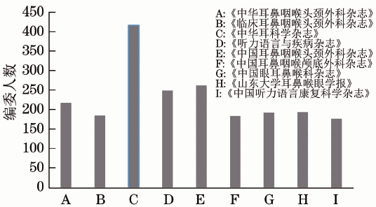 (2) 编委会人数差异较大。9种期刊的编委人数为164——414位(图1),平均(229.11±76.35)位,其中最多的是《中华耳科学杂志》,编委人数达414位,最少的为164位。考虑到《中华耳科学杂志》的编委人数远远超过其他期刊,将其剔除后统计得出其他8种期刊的平均编委人数为(206.00±34.17)位,95%可信区间为[177.4,234.6]。