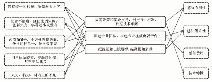 从微观层面来看,我国科技期刊的视频出版存在以下问题:在制作上,没有统一的标准,质量参差不齐,配音不清晰,画面比例失调、色彩失真,字幕过小或没有;在传播上,视频没有DOI号,不方便直接访问,传播途径单一,传播效率差,利用率低,用户体验较差,视频缓冲慢,甚至无法播放。除此之外,在内容的“丰富性”“严谨性”以及“生动性”等方面都难以达到规范的播出标准,这些问题亟待解决[13,15]。从根本来看,现存问题是由视频内容生产者和传播者对产品定位不明确、对用户分析不到位造成的:一方面缺乏对产品价值的分析,导致产品功能的指向性不明确,不能很好地利用视频形式表现内容;另一方面则缺乏对用户的分析,视频技术的使用并没有更好地满足用户的需要,进而导致用户不能在短时间内快速、便捷且高效、精准地获取有价值的信息。