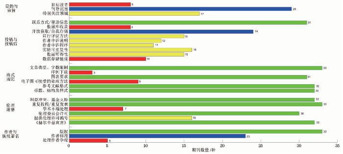 “格式规范”包括6个分项,其中4个分项被30——33种期刊提及。只有3种期刊提供格式样例下载,大多数期刊采取开放获取的出版模式,作者有多种途径下载论文,因此稿约中较少提供样例下载。电子图抄袭或造假是比较隐蔽的学术不端形式,不像论文复制比可以用CrossCheck等软件检测,但只有9种期刊明确说明了“电子图可接受的处理方法”,可见,期刊防范学术不端仍主要关注重复投稿/发表,抄袭剽窃等简单手段。此外,较少有期刊稿约提及医学研究实施与报告指南,如《系统综述和荟萃分析优先报告的条目:PRISMA声明》(Preferred Reporting Items for Systematic Reviews and Meta-Analyses: The PRISMA Statement)、CONSORT声明、非随机对照试验研究报告规范(Transparent Reporting of Evaluations with Non-randomized Designs Reporting Guidelines)、临床病例报告指南[The CAse REport (CARE) Guidelines]等。