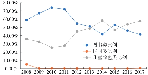 从贸易结构来看,图书类和儿童涂色类一直都是中国对中东欧地区出版物出口贸易的核心,二者所占比例达到95%以上(见图3)。而中国对中东欧地区的报刊类出口一直处于较低水平,多数年份所占比重不足1%。中国对中东欧地区图书类和儿童涂色类出口比例处于此长彼消状态。2008年至2013年间图书类是中国出版业对中东欧地区出口的主要出版物,2010年所占比例高达74%,但是接下来几年持续下降。相反,我国向中东欧地区出口的儿童涂色类占出版物出口贸易的比例持续增高,2013年之后成为中国出版业对中东欧出版物出口新的重心。