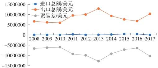 对比2008-2017年我国出版物进出口贸易情况(如图2所示),我国对中东欧出版物贸易持续处于顺差状态。在2013年顺差额高达1279万美元,约为当年进口总额的108倍。