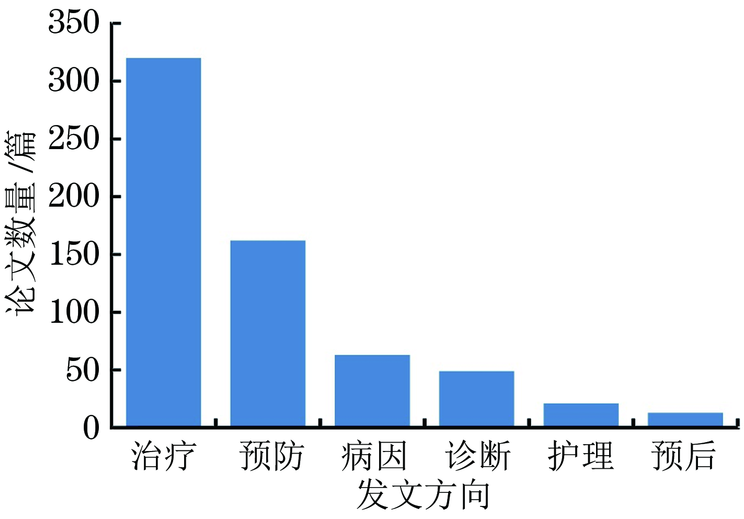 新冠肺炎专题的发文范围覆盖了新冠肺炎治疗、预防、病因、诊断、护理和预后6个方向。图2所示为新冠肺炎专题中6个方向的发文数量。可以看出:治疗类发文数量最多,占总发文量的52.9%;预防类论文数量次之,占总发文量的26.8%;预后类论文的数量最少,仅占总发文量的2%。以上科技期刊的论文刊载规律,与疫情暴发期间对新冠肺炎治疗和预防知识的需求量最大的现实情况相符。