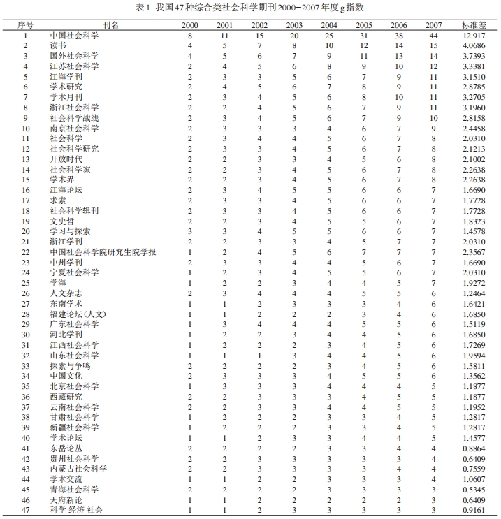 表1则列出了这47种期刊2000至2007年的g指数并按g指数降序排列。从表1可以看出,期刊g指数随着年代的增长而增加,其中《中国社会科学》成明显的跳跃式增长,其它期刊增长幅度较小,在相邻的年份里g指数不变或者增加1,少数增加2。g指数7以下的刊物通常需要经过两三年甚至更久的积累才能使其g指数增加1。《中国社会科学》g指数连续八年排名首位,并且与其它期刊拉开了较大的差距,表明该刊质量确实比较高,并且具有很高的学术影响力。《读书》、《国外社会科学》等一批期刊的g指数也保持了良好的发展趋势,影响力不断提高。