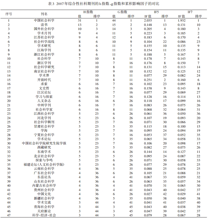 学术期刊的影响力评价研究备受期刊出版界和图书情报界的重视。影响因子作为一个经典的文献计量学指标,其对期刊影响力的评价功能已为国内外文献计量界所公认【4】,h指数和g指数提出后,受到广泛关注,成为新的研究热点。表3列出了2007年我国综合性社科类期刊中47中CSSCI来源期刊的h指数、g指数和累积影响因子的值及其排序。