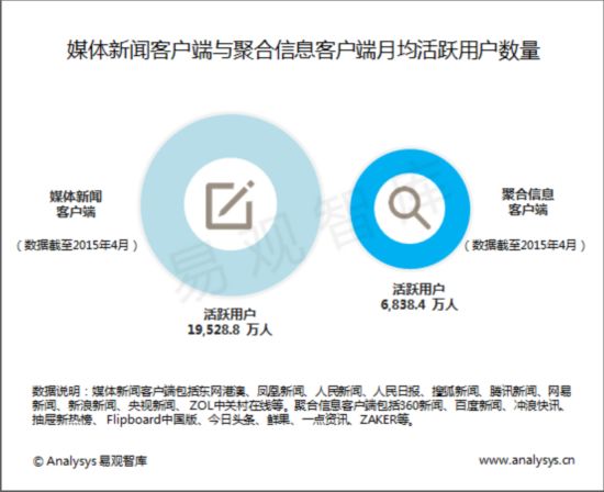 近日Analysys易观智库产业数据库发布《中国移动新闻资讯APP市场专题研究报告2015》,就中国互联网用户移动新闻资讯APP使用情况、区域差异、用户属性进行梳理,聚焦媒体新闻类APP和聚合信息类APP进行细分研究。