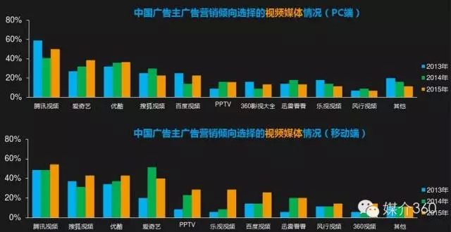 2014和2015两年中,电视都是占营销费用比例最高的媒介。