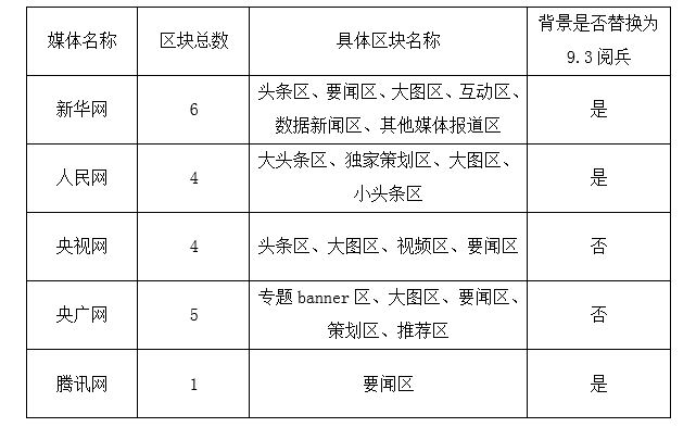 央视网:央视网利用其首页的4个区块进行集中体现,分别是:头条区、大图区、视频区和要闻区。在版面安排上,央视网充分发挥自身视频报道优势,在图片下方的中央区,开辟大块区域进行有关阅兵的视频报道。