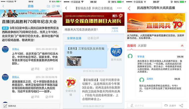 此次报道,各客户端除转发央视直播视频外,皆开设了阅兵式直播页面,用包括文字、图片和视频短片等在内的多种形式为用户进行移动端直播。