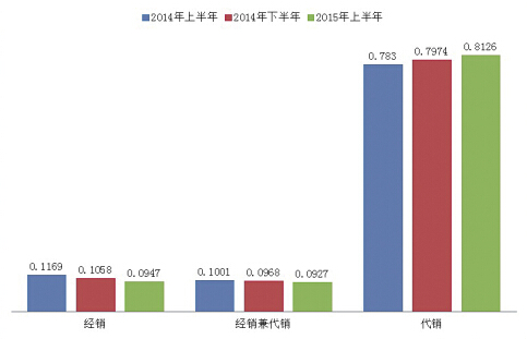 发行市场代销比例增加,期刊竞争压力增大。为避免发行量的下滑,部分期刊或渠道商开始加大代销比例。从2012年至2014年期刊销售渠道对比来看,经销比例、经销兼代销比例都呈下降态势,代销比例连续两年呈现增加态势,代销比例的增加可以说缓解了部分报刊亭主的压力,但也使期刊发行压力增大。