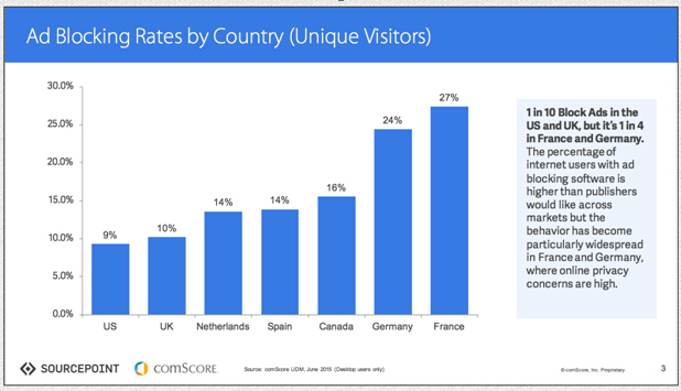 comScore公司是一家全球性互联网信息服务提供商,是美国知名的互联网统计公司、互联网流量跟踪分析公司和市场调研公司。这家公司新近发布的统计结果如下图,请注意,这是纯粹基于桌面端的统计,而不是预测。comScore发现,实施广告拦截的用户恰好是那些重度用户,他们通常比不用拦截插件的人在某个网站逗留时间更长。以页读数计算的被拦截率,平均要高出三至四个百分点。预测姑妄听之,基于大数据的统计却必须正视。在comScore的这项统计中,德国、法国的广告拦截率已经超过24%。