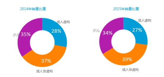 与2014年相比,成人非虚构类图书的销售比重有所增大,由2014年40%的份额上升到今年41%的份额;同时,少儿非虚构类图书也有所上升,同比上升一个百分点。