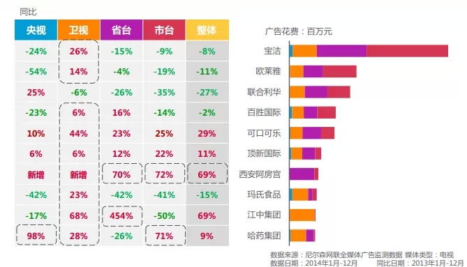 2014年电视广告资源仍然处于调整期,整体下降9%,刊例花费下降1%。中央台的时长降幅最大,其中1套、3套、8套、13套分别减少6%、34%、33%、7%;在省级卫视时长整体下降之中,湖南卫视、浙江卫视分别增长7%和4%。