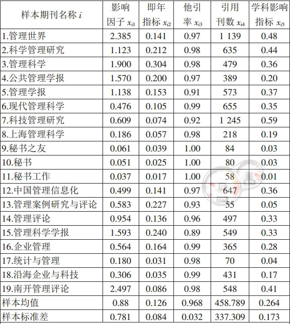 期刊评价中涉及较多的指标,笔者在对国内外评价指标体系了解之后,找出目前期刊评价中应用频率较高的18 个指标:平均引文数,平均作者数,机构分布数,地区分布数,海外论文比,基金论文比,总被引频次,文献选出率,来源文献量,引用半衰期,被引半衰期,即年指标,h 指数,他引率,影响因子,引用刊数,学科影响指标,学科扩散指标。在期刊评价的过程中,考虑到管理学学科特点和公平性原则,需要对指标进行分析和筛选。管理学相对其他学科发展比较晚,但是关注度越演越烈,管理学期刊应该注意观察学科走向和创新能力,同时注重和国外的学术交流,开阔视野,因此我们选取了即年指标和海外论文比这两个指标。本文是以管理学为研究对象,舍弃学科扩散指标,选取学科影响指标,以便反映本学科的影响力。