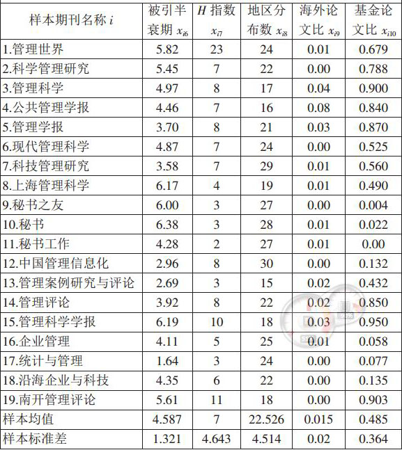 2013 年版《中国期刊引证报告(扩展版)》的统计结果,得到了 19 种管理学期刊上述 10 个指标统计数据作为本文的分析材料(见表 1),其中表示第 i 种期刊的第 j 项评价指标在 CNKI 数据库(2013 年)中的取值,i=1,2,…,19,j=1,2,…,10。
