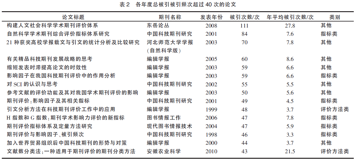 通过对期刊评价论文被引频次的分析, 可以确定其研究热点,挖掘期刊评价的经典文献,为今后的研究和发展提供借鉴和参考。表2 详细介绍了年平均被引频次超过40 次的12 篇论文的相关信息。