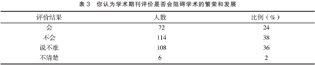 学术期刊是学术链条中一个不可或缺的重要环节。尽管学术期刊评价为反映学科的发展规律,历经了一个由单一视角到多维视角、简单指标到复合指标、单一方法到单一方法与组合评价共存的动态发展过程,但其评价带来的负面结果使越来越多的学者开始批判现行的学术期刊评价体制,认为这种评价会阻碍学术的繁荣与发展,甚至出现了”学术期刊不需要评价”的声音。但是,从本次调查结果看,有242人。占80.67%的人认为“有必要”对学术期刊进行评价;认为”没必要”对学术期刊进行评价的有42人,占14%;而对学术期刊评价持“无所谓”态度的仅16人,占5.33%(见表2)。在”学术期刊评价是否会阻碍学术的繁荣和发展”这一问题上,有72人,占24%的人认为“会”阻碍学术的繁荣和发展;有114人,占38%的认为”不会”阻碍学术的繁荣和发展;有108人,占36%的人认为“说不准”;”‘不清楚”这个问题的有6人、占2%(见表3)。