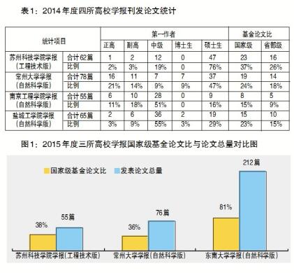 从统计数据来看,相对而言,《苏州科技学院学报(工程技术版)》和《常州大学学报(自然科学版)》发表论文的国家级基金与省部级基金比略高一点,但就作者情况而言,大量集中在硕士研究生与中级职称群体,占六七成以上;而博士研究生、副高或正高级职称作者所占比例较少。
