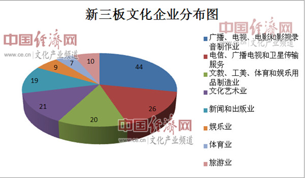 据中国经济网文化产业频道小编不完全统计,截止12月29日,共有156家文化企业登录新三板,其中“广播、电视、电影和影视录音制作业”44家,“电信、广播电视和卫星传输服务”26家,“文教、工美、体育和娱乐用品制造业”20家,“文化艺术业”21家,“新闻和出版业”19家,“娱乐业”9家,“体育业”7家,“旅游业”10家。