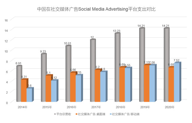 2015年,中国“社交媒体广告”(”SocialMediaAdvertising”)市场营收达9.228亿美元,占据整个国家GDP的。预计接下来(CAGR2015-2020)平均年增长率达9.03%,市场营收规模在2020年达到14.218亿美元。平均每位受众用户贡献1.65美元。